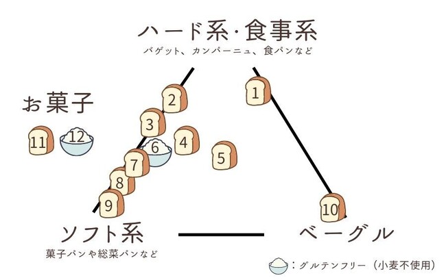 2022年10月以降に公開した99店舗のお店の中から、リピート率と受け取られた方の満足度から算出した指標を基に12店舗が選出されました。さらにその12店舗を「ハード系」「ソフト系」「ベーグル」の3つの軸に分けてそれぞれ分類いたしました。