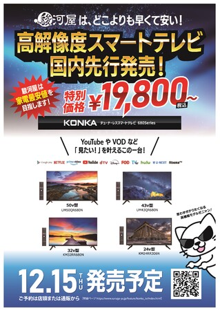 通販サイトの駿河屋JPと全国の駿河屋のお店では、テレビ受信機(チューナー)が内蔵されていない、Android TV搭載「KONKA チューナーレススマートテレビ 680Series」を国内最速の12月15日(木)発売します!