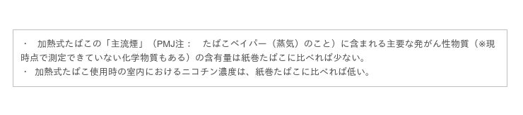 今回の改正に伴い、厚生労働省が公開している「加熱式たばこにおける科学的知見」では、国立がん研究センター委託事業「たばこ情報収集・分析事業」による調査の結果を引用し、加熱式たばこの「主流煙」(PMJ注:たばこベイパー(蒸気)のこと)には、紙巻たばこと同程度のニコチンを含む製品もある」一方で、以下の二点を「科学的知見」として提示しています。