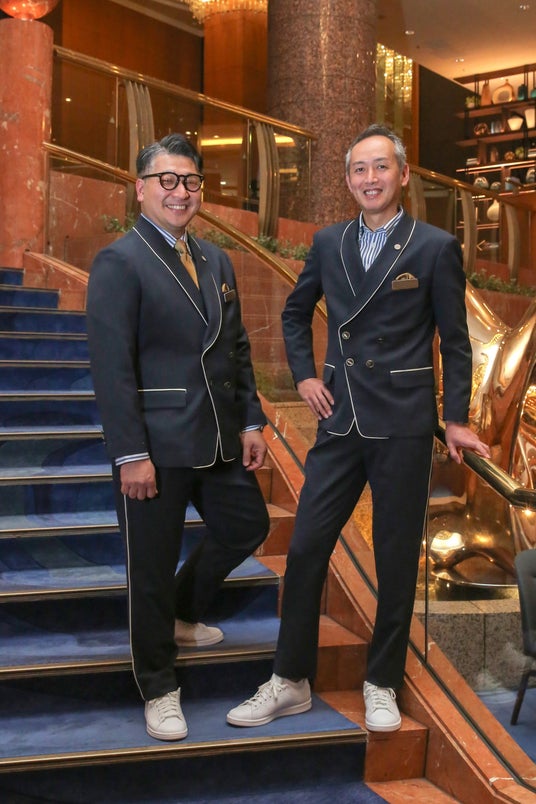 タキシードに使われるショールカラーのジャケットに、ジャージをイメージしたパイピングのラインを取り入れたスポーティーなスタイル。パンツスタイルとスカートスタイルは個人が自由に選択することができ、ジェンダーに捕らわれないダイバーシティを意識したデザイン。ノーネクタイとすることで快適性を高めたり、リボンタイをワンポイントアクセントにしたりと、個性を表現できる遊び心も忘れないスタイリングを起用。ホテルらしいフォーマルさと機能性を重視したカジュアルさのバランスが良く、スタイルに合わせて靴もデザインを選択できることが特徴。