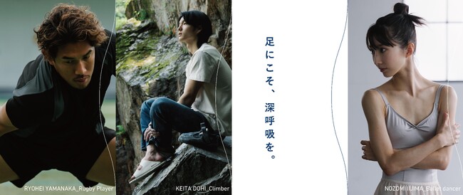 本キャンペーンでは、バレエダンサーの飯島望未、ラグビー選手の山中亮平、スポーツクライマーの土肥圭太に焦点を当て、彼らの競技に対する取り組みや、ハードなトレーニングや競技用のシューズを着用した後の足の様子、そして足に対する思いを捉えています。映像やインタビューにおいて垣間見ることのできるアスリートの目線は、”足の健康”を支えてきたブランドの核と共鳴するものであり、穏やかな回復をもたらす製品への信頼が、キャンペーンを通して描かれています。