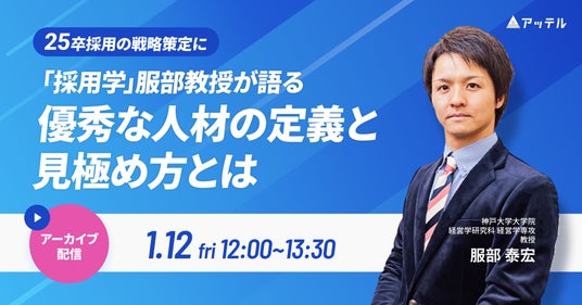 AI適性検査「アッテル(Attelu)」を展開する株式会社アッテル(本社:東京都渋谷区、代表取締役:塚本 鋭)は、新卒採用人事向けの無料オンラインセミナー『「採用学」服部教授が語る 優秀な人材の定義と見極め方とは』を2023年1月12日(金)に開催いたします。