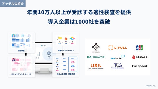 「アッテル」は、適性検査やサーベイによるデータ蓄積から分析、AIによる各種予測までをワンストップで実現できるピープルアナリティクスクラウドです。2020年5月のリリースから約3年で、上場企業を中心に1000社以上に利用されています。また、HRアワードやHR tech GPなど数多くの人事関連アワードを受賞するなど、評価もいただいています。