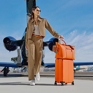 トラベルユニフォーム(Camel)、トラベルトート(Manhattan Orange)、The Carry-On スーツケース(Manhattan Orange)