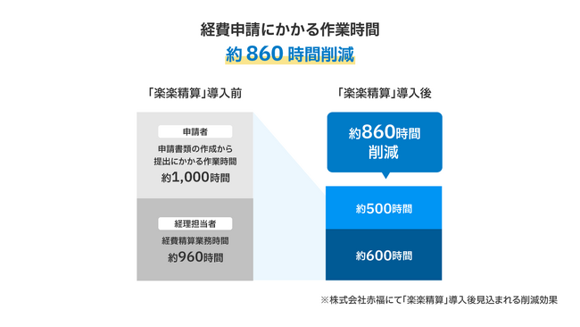 「楽楽精算」の導入により、経費精算における申請者・経理担当者の作業負荷を軽減し、経費精算にかかる作業時間を年間で約860時間削減します。