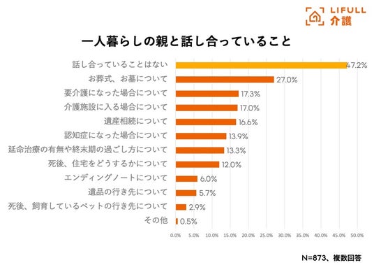 一人暮らしの親と先々のどのような事柄を話し合っているかを聞いたところ、最も多かったのは「話し合っていることはない」(47.2%)となり、老後について親子で話し合うことの難しさがうかがえました。
