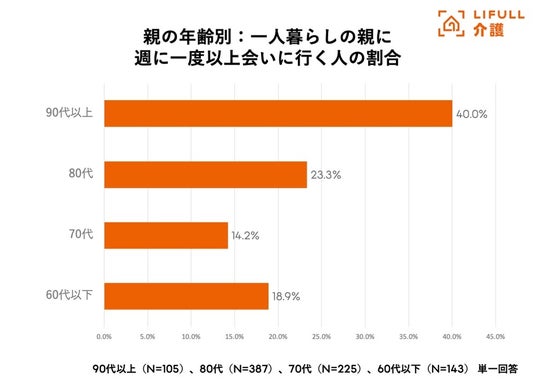 特に親の年齢が上がると共に頻繁に会いに行く傾向が強くなり、90代以上の一人暮らしの親を持つ人の40.0%が、「週に一度以上」会いに行くと回答しました。