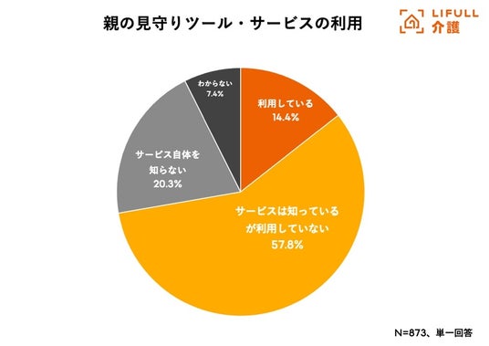 見守りツール・サービスの利用について聞いたところ、利用している人は14.4%にとどまり、57.8%の人は「サービスを知ってるが利用したことはない」と回答しました。
