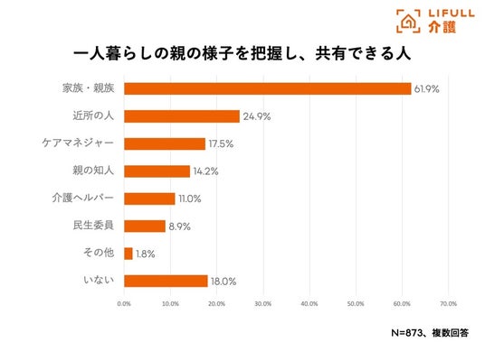 自分以外に一人暮らしの親の様子を把握している人を尋ねたところ、圧倒的に多かった「家族・親族」(61.9%)以外で多かったのは「近所の人」(24.9%)、「ケアマネジャー」(17.5%)でした。