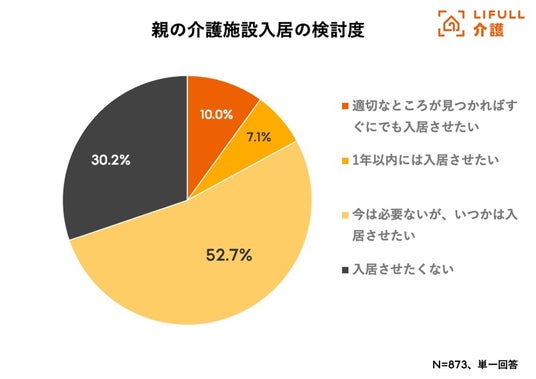 一人暮らしの親の介護施設への入居意向を尋ねたところ、52.7%が「今は必要ないが、いつかは入居させたい」と回答しました。
