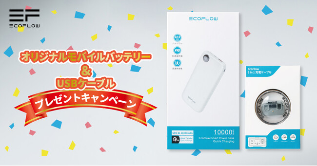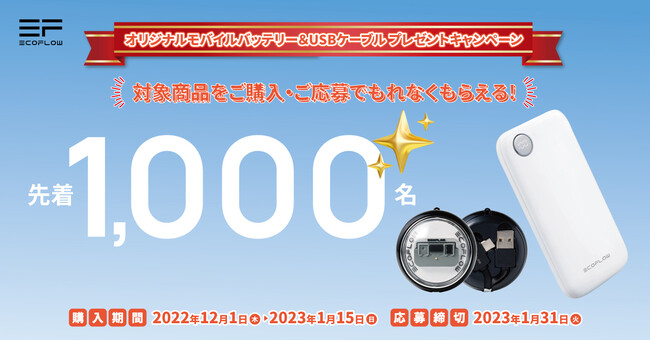 最先端のポータブル電源やクリーンな電力技術を開発するテクノロジー企業、EcoFlow Technology Japan株式会社(本社:東京都江東区、以下EcoFlow)は、2022年12月1日(木)より数量限定「プレミアムプレゼントキャンペーン」を開催することをお知らせいたします。キャンペーン期間中、正規取り扱い家電量販店(一部店舗は対象外)の店頭およびECサイトにて対象製品をご購入・ご応募いただいた先着1,000名様に「オリジナルモバイルバッテリー&USBケーブル」をもれなくプレゼントいたします。