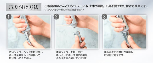 RELAXEEシャワーヘッドは、G1/2規格の標準シャワーヘッドに対応しており、4種類のアダプターが付属しているため、工具を使わず簡単に取り付けられます。自宅のシャワーに簡単に設置できるので、購入後すぐに使用可能です。