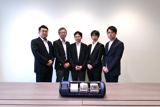 金沢大学の木村寛之教授(中央)、東京電機大学の茂木克雄教授(中央左)、産業技術総合研究所の高田尚樹研究グループ長(中央右)、Labokoの小此木孝仁氏(左)、DigitalBlastの松本翔平(右)と、DigitalBlastが開発を進めるライフサイエンス実験装置「AMAZα(アマツ・アルファ)」のモックアップ