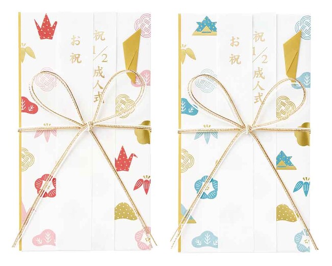 価格:528円(税込)/種類:赤、青/製品寸法:100×180mm/内容:本体1枚、短冊6枚(お祝、祝1/2成人式、お誕生日祝、七五三お祝、ご入学祝、ご入園祝)、中袋1枚/製品紹介ページ:https://paper.maruai.co.jp/shop/c/c01039926
