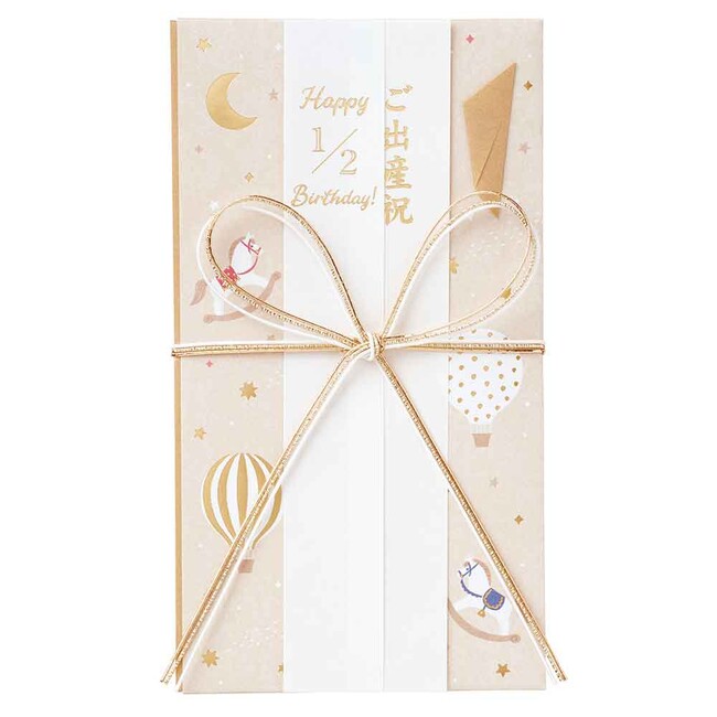 『赤ちゃんのお祝』は、ベージュ色の本体にバルーンや木馬のモチーフをあしらったやさしい雰囲気のデザインです。表書きは「ご出産祝」をはじめ、赤ちゃんの生後6ヶ月を祝う「ハーフバースデー」や初めて迎える1歳の誕生日を祝う「ファーストバースデー」、「初節句お祝」など5種が付属します。