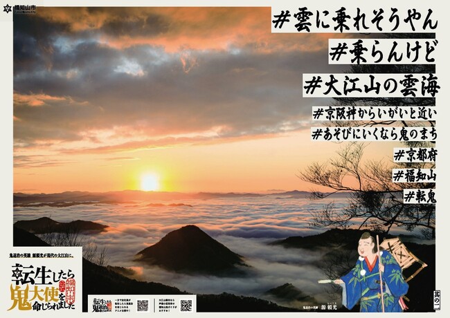 京都府福知山市は、「鬼のまち福知山」発信のため、本市にある「大江山鬼伝説」の絵巻物をもとにした好評公開中のWEBアニメ「転生したら鬼退治を命じられました」(以下、動画「転鬼」)のスピンオフ企画として、「転生したら鬼大使を命じられました」をポスターとSNSで展開します。ごく普通の会社員が平安時代の英雄・源頼光(ライコウ)に転生して鬼退治をする動画「転鬼」が“A面”だとすると、今度は“B面”として、源頼光が現代の“鬼の聖地”大江山に転生し、鬼大使として絶景スポットを巡る設定のポスターを制作。全7種類で、それぞれに「#世界一デカい鬼瓦 #勝てる気せぬ」「#エクストリーム参拝 #天岩戸神社」などの頼光視点のつぶやきが載っています。
