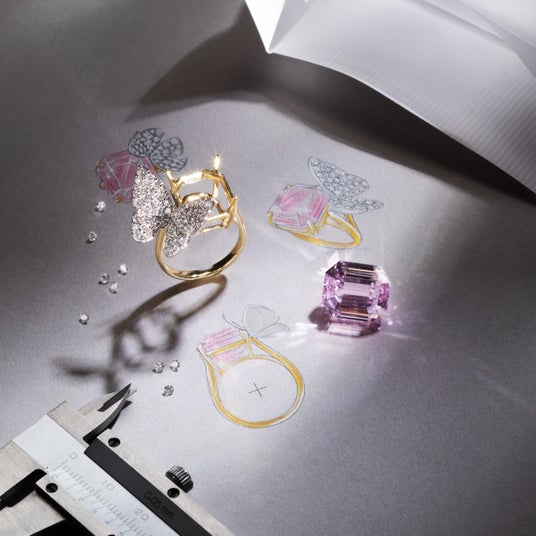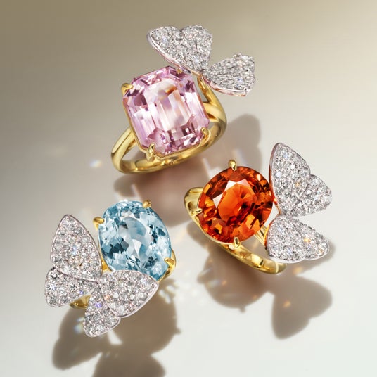 プレミアムラインとして、7カラットを超える、まるで大輪の花のような大粒の宝石と、それに寄り添う蝶がロマンチックなリング「ブーケ パピヨン プリンシパル」を展開します。デザイナーの感性と職人の緻密な技術が紡ぎだす、情緒的な美しさをたたえた作品は、透明感と輝きにこだわり、デザイナーがセレクトした「クンツァイト」「アクアマリン」「マンダリンガーネット」の3種類の宝石でご用意しました。