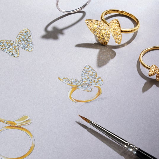 さりげないサイズ感で毎日身につけやすい「ブーケ パピヨン S」。蝶の羽の間にカラーストーンを合わせれば、花に惹き寄せられた蝶のように。同じシリーズでいくつも重ねれば、これ以上ないほどロマンティック。愛らしさがより一層高まるアイテムです。