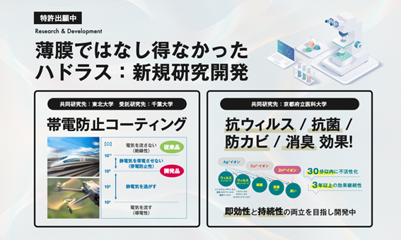 当社は「常識を塗り替える」をスローガンに、ナノマテリアルコートの研究開発を行い、市場に提供し続け、常にイノベーションを起こしています。ナノマテリアルコート:ハドラスシリーズは、産学官連携での研究開発を推進し、10年以上の歳月をかけて完成しました。今後も研究開発を継続し、社会やお客様に貢献していきます。