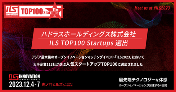 ハドラスホールディングス株式会社(本社:東京都江東区、代表:山本英明、以下「ハドラス」)は、2023年12月4日(月)から7日(木)まで行われます『INNOVATION LEADERS SUMMIT 2023』(ILS2023)に出展いたします。ILSは、大手企業とスタートアップをマッチングし、革新的な新事業を創出することを目的に、経済産業省後援のもと2014年に発足したアジア最大のオープンイノベーションマッチングイベントです。前回ではメインの新事業マッチングプログラム「パワーマッチング」にて、国内外の主力VCや政府機関など102機関が推薦する有望スタートアップと大手企業が参加いたしました。今回、当社は本イベントのTOP100 Startupsに選ばれ、新製品2種を展示し、公開いたします。