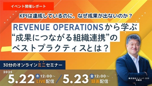 株式会社イノーバ(本社:東京都新宿区、代表取締役:宗像 淳、以下イノーバ)は、2025年5月22日に開催した無料オンラインウェビナー「KPIは達成しているのに、なぜ成果が出ないのか? Revenue Operationsから学ぶ“成果につながる組織連携”のベストプラクティスとは?」のダイジェストレポートを公開しました。