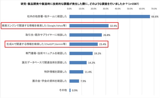製造業における研究・製品開発・製造従事者を対象に、技術的課題発生時の調査方法について尋ねたアンケート結果