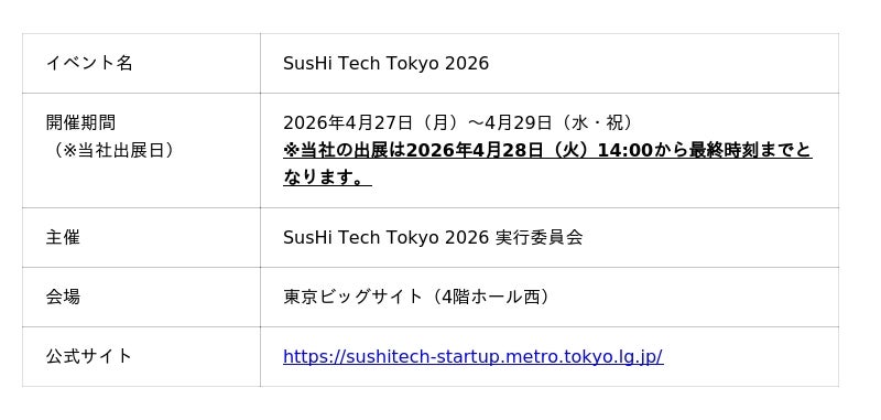 今回のSusHi Tech Tokyo 2026への出展など、投資先各社のさらなる事業成長と国内外への認知拡大を後押ししてまいります。