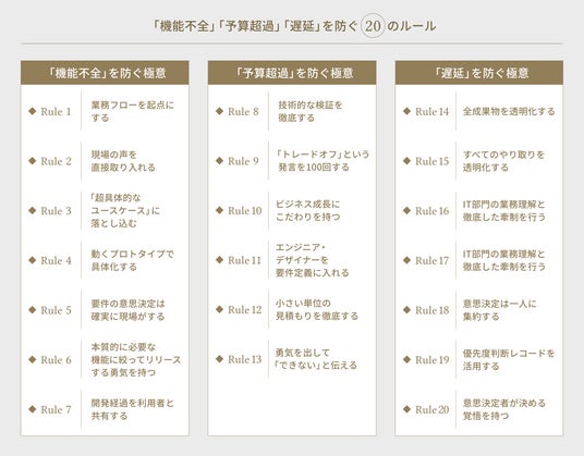 本書では、要件定義を成功に導くための実践的なノウハウを、「20のルール」として体系化しました。いずれも単なる理論ではなく、実際のプロジェクト経験から導き出された「実務者のための原則」であり、現場でそのまま活用できる具体的な行動指針としてまとめています。