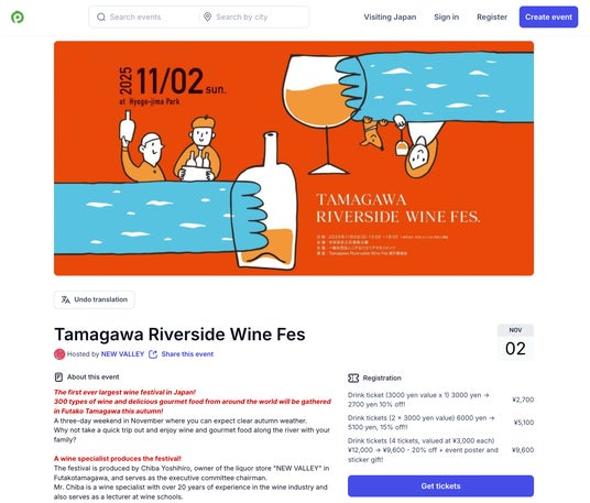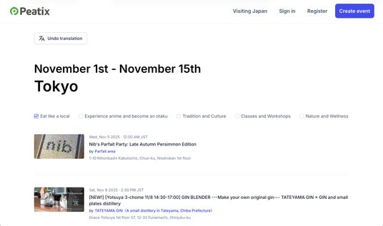 掲載されるイベント情報は、ピーティックス( https://peatix.com )の掲載情報と連動しており、日本国内の主催者がピーティックスに登録したイベントページの内容が反映されます。特別な手続きや準備は必要なく、ピーティックス上でイベントページを作成すれば「Visiting Japan」を通じたインバウンド集客が可能になります。