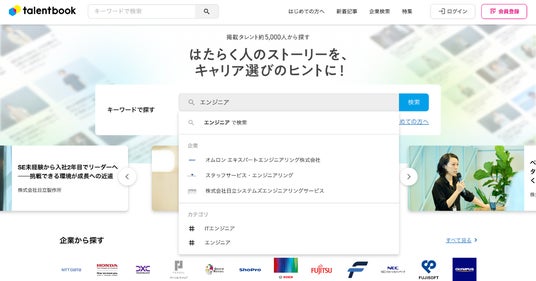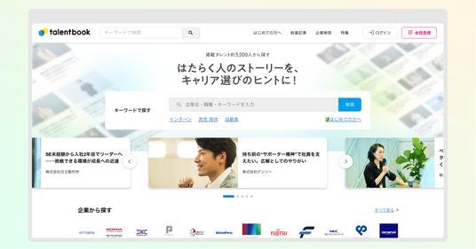 talentbook(タレントブック)はキャリアを学べるサイトです。talentbookには企業で働くタレント約5,000人の記事が掲載されています。記事に記載されているタレントのキャリアや働き方、企業に関する情報を提供することで、就職活動や転職活動、より良いキャリア形成の実現をサポートします。