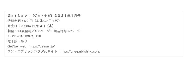 株式会社 ワン・パブリッシング(東京都台東区/代表取締役社長:廣瀬有二)は、2020年11月24日(火)に「GetNavi(ゲットナビ)1月号」(特別定価:本体573円+税)を発売いたします。