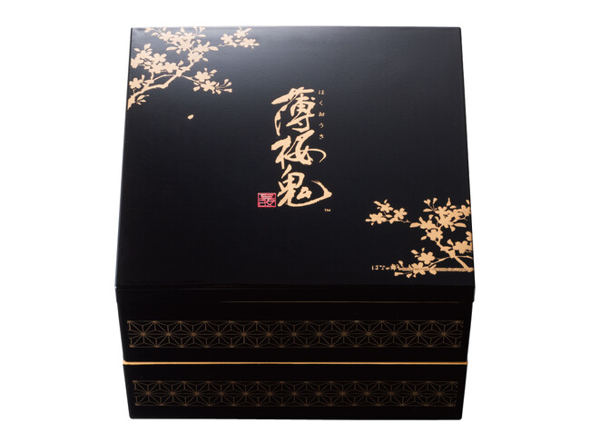 黒色のお重に金色の文字。両端にあしらった金色の桜が薄桜鬼のロゴをさらに引き立てます。