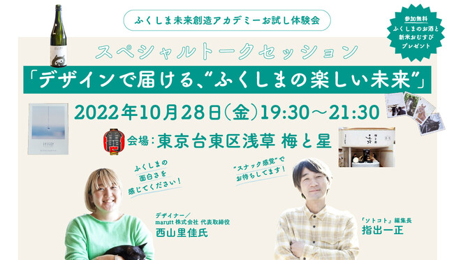 2022年11月からスタートする、福島の12市町村を舞台とした関係人口講座「ふくしま未来創造アカデミー」。開講に先駆けて、ゲストによるスペシャルトークセッションと講座をお試し体験できる説明会を10月28日(金)の夜に開催します!
