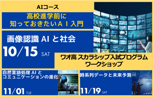激動の時代を生き抜く力を、実学と教養によって育む、学校法人ワオ未来学園ワオ高等学校(本校所在地岡山県岡山市 校長山本潮)(以下ワオ高校)は、2021年4月開校。好きな時間に好きな場所で学ぶことができる完全オンラインの学校として、未来型の学びを提供しています。このたび、「ワオ高 スカラシップ入試プログラム(総合型選抜)」のB(後期)日程の受付開始(11/30エントリー〆切)にあたり、AIコースのワークショップ&説明会を10月から11月にかけて開催しますので、お知らせします。
