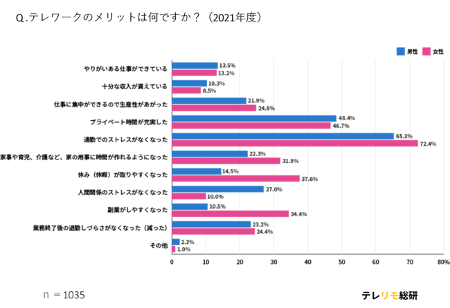 次いで、「プライベート時間が充実した」、「人間関係のストレスがなくなった」と続き、こちらも2020年と同様の結果となりました。時間の有効活用や精神的なストレス軽減はテレワーク最大のメリットと言えそうです。なかでも、「プライベート時間が充実した」と回答した女性は前回から約7%増加しています。