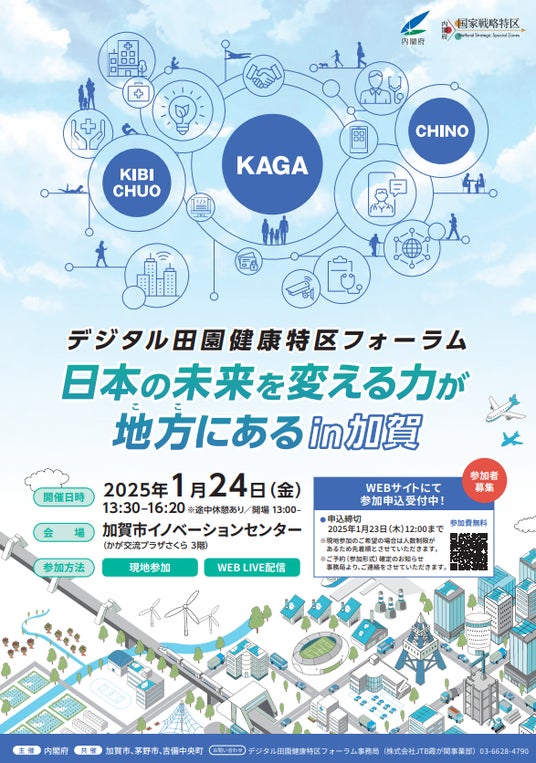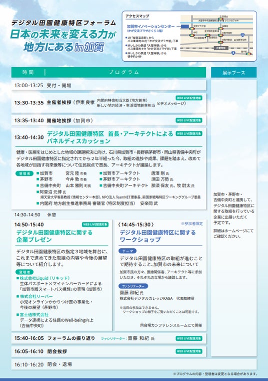 本フォーラムでは、これまでの取組の理解促進・機運醸成を目的として、地域住民や関係者等が一堂に会し意見交換を行い、またその成果の横展開に向けて、全国の自治体や関連事業者等に情報発信するため、石川県加賀市を会場として「デジタル田園健康特区フォーラム 日本の未来を変える力が地方(ここ)にあるin加賀」を開催します。
