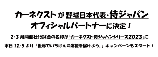 これに伴い、来年2月と3月に開催される2023 WORLD BASEBALL CLASSIC™に向けた侍ジャパン壮行試合の大会名称は、『カーネクスト侍ジャパンシリーズ2023』となり、世界一を目指す侍ジャパンを応援して参ります。