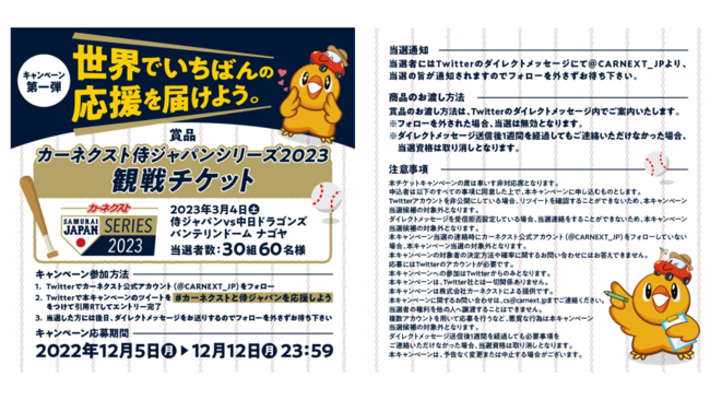 カーネクスト公式Twitterをフォローし、対象投稿に「#カーネクストと侍ジャパンを応援しよう」をつけて引用リツイートして頂くと、抽選で30組60名様に、2023年3月4日(土)にバンテリンドーム ナゴヤで開催される「カーネクスト侍ジャパンシリーズ2023」の侍ジャパンvs中日ドラゴンズの観戦チケットをプレゼントいたします。