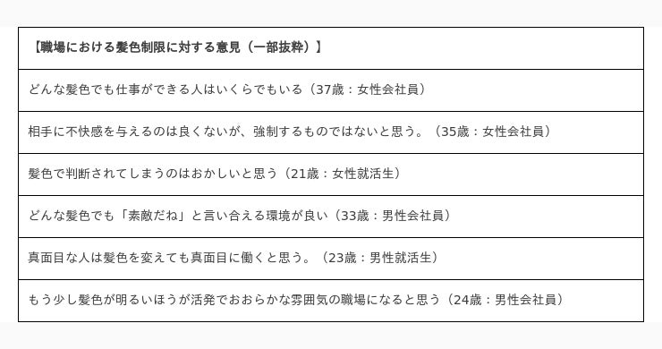 ・「強制するものではないと思う」「髪色で判断されてしまうのはおかしいと思う」などの回答