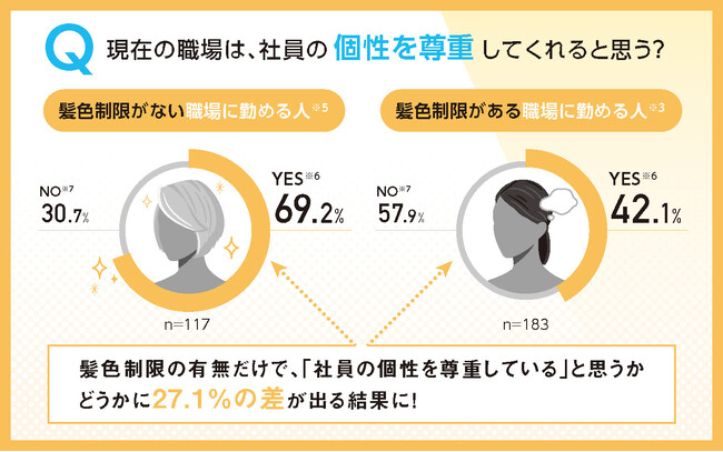 髪色制限の有無で「社員の個性を尊重してくれる職場だと思う」かどうかに27.1%の差
