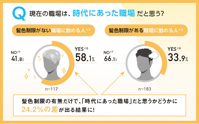 髪色制限の有無で「時代に合った職場だと思う」かどうかも24.2%の差