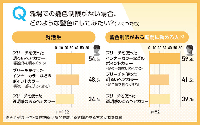 会社員では「インナーカラーなどのポイントカラー」、就活生では「ブリーチを使った明るいヘアカラー」が支持される