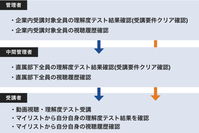 当サービスではプログラムごとに理解度テストをご用意しているため企業内の受講対象者全員の理解度テスト結果確認(受講要件クリア確認)や企業内受講対象者全員の視聴履歴を確認することが可能です。また受講者はマイリストから自分自身の理解度テスト結果や自分自身の視聴履歴確認が確認できるため学習状況を常に確認することができます。