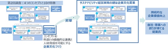 その結果を「4つのコンセプト、10の特徴」から検証すると残念ながらサステナビリティ経営への取り組みの停滞感が見えてきています。ただし、その中でも4つのコンセプトの中の「外部との積極的な連携と人材育成を可能にする企業文化づくり」がこの範疇にとどまらず企業のサステナビリティ経営実現のための重要なポイントとして昇華していることがうかがえました。特に先進企業では「戦略・仕組みづくり」と同時並行して「企業文化変革」に取り組むことがサステナビリティ経営の推進・実現のポイントとなっています。