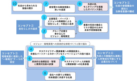 その調査結果を踏まえ、日本企業の未来が明るく輝くように、サステナビリティ経営をうまく進めていくための実践的な考え方とポイントについて、以下のようにまとめました。