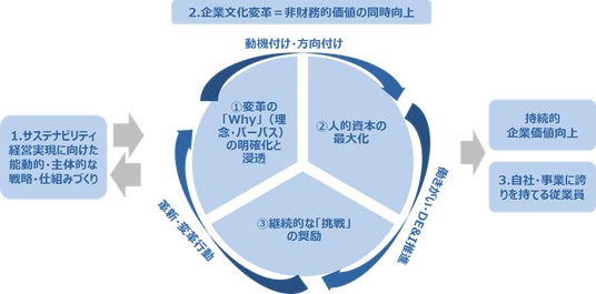企業文化変革によって非財務的価値を向上することが、財務的価値の追求レベル向上にもつながり、結果として企業価値の最大化を実現すると考えます。また、自社・事業に誇りを持てる従業員が増えることで働きがいが向上し、そのことが企業活動のレベルアップを実現するという好循環サイクルにつながると言えます。