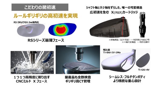 「RS SPEEDドライバー」は、「RS」シリーズで最もシャローなヘッド設計でスイング中の空気抵抗軽減を図ったほか、軽量でありながらヘッドの走る感触としっかり感を併せ持ち、ヘッドスピードを加速させる専用設計のシャフトを採用しました。また、「RS」シリーズ最薄となる「CNCミルド X フェース」によりルールギリギリの高初速性能をしっかりと踏襲したほか、ヘッド内部の効果的な質量配置とシャローヘッドによる低・深重心設計でハイドロー・高強弾道で飛ばせるドライバーに仕上げています。このほか、PRGR独自のシャフト軸と装着ネジ軸をずらした「軸ズレ構造」の「X(クロス)カートリッジ」を搭載し、広い高初速エリアを維持しながらゴルファーのスイングに合わせた多様な弾道調整が可能となっています。
