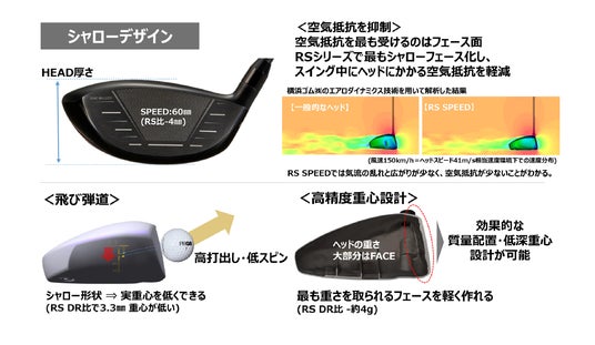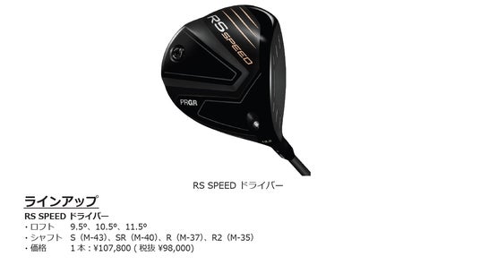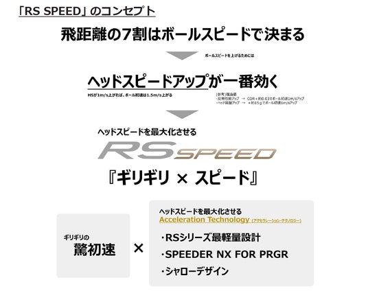 (株)プロギアは、ゴルフを真剣に楽しむアスリートゴルファーに向けた「RS(アールエス)」シリーズから、「ギリギリ×スピード」をコンセプトに同シリーズ最軽量かつルールギリギリの高初速性能とゴルファーのヘッドスピードを最大限に引き出す「Acceleration Technology(アクセラレーション・テクノロジー)」を搭載した「RS SPEED(スピード) ドライバー」を5月16日から発売します。クラブ質量を 270g 台 (SR / R / R2)に抑えたほか、専用設計のシャフトとシャローデザインといったテクノロジーを融合し、振り切れることでゴルファーのポテンシャルを引き出し飛距離アップを可能にしています。同時に「RS」シリーズ最軽量かつシャローデザインでやさしさを追求した高弾道で飛ばす「RS SPEEDフェアウェイウッド」と高弾道で狙える「RS SPEEDユーティリティ」も発売します。