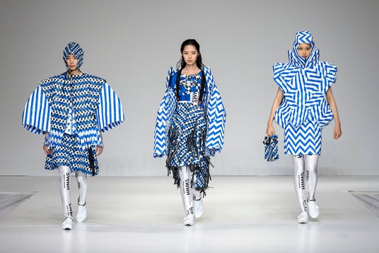 コンセプト:女性たちが自転車に乗ることで当時の抑圧的な環境から抜け出し、ひと時の自由を謳歌したという19世紀イギリスの歴史に着目し、サイクリングカルチャーが現代でも解放の象徴になると考え、今回の作品を制作。バリケードテープとチューブを用いたテキスタイル作りにより、コンセプトに合った仕上がりになりました。