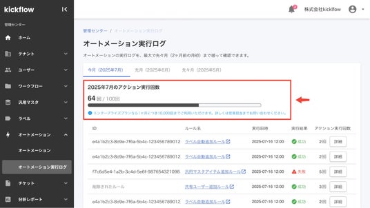 オートメーションの実行状況を確認できる画面にて、月々のアクション実行回数が確認できるようになります。